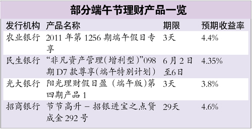 据第一理财网的数据显示, 端午节理财产品的收益率在3.8%~4.85%。其中,民生银行、光大银行将端午节理财产品的年化收益抬高,这些短期理财产品收益率与其3个月以上理财产品收益率相当的水平。