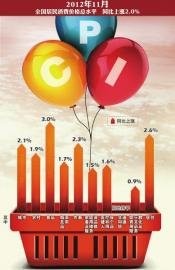 国家统计局网站发布数据显示,2012年11月份,全国居民消费价格总水平同比上涨2.0%,略低于此前分析机构普遍预测的2.1%。11月CPI同比上涨幅度相比10月上涨0.3%。这是CPI在“1”时代连续徘徊两个月后,重返“2”时代。同时,11月全国工业生产者出厂价格(PPI)也随之公布,11月份PPI同比下降2.2%,环比下降0.1%。