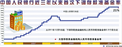 中国人民银行11月30日晚间宣布,从2011年12月5日起,下调存款类金融机构人民币存款准备金率0.5个百分点。这是央行三年来首次下调存款准备金率。经济学家认为,准备金率的下调将有助于在当前复杂形势下保持经济的平稳较快增长。
