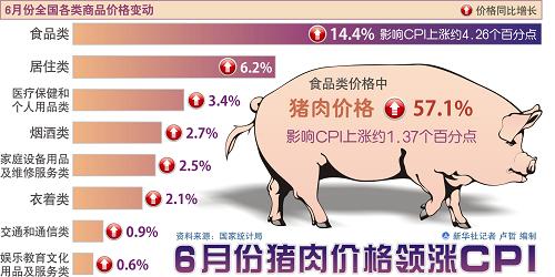 6月份,全国居民消费价格指数同比上涨6.4%。 其中,城市上涨6.2%,农村上涨7.0%; 食品价格上涨14.4%, 毋庸置疑又成为此次新高的主要推手,对价格总水平的影响约4.26个百分点,特别是猪肉价格上涨57.1%,影响价格总水平约1.37个百分点,此外,粮食、鲜蛋、水产品、蔬菜、水果价格总共对CPI的影响约1.09个百分点;除了食品价格外,非食品价格上涨3.0%;消费品价格上涨7.4%,服务项目价格上涨4.0%。特别是居住类价格同比上涨6.2%。其中,水、电、燃料价格上涨4.1%。